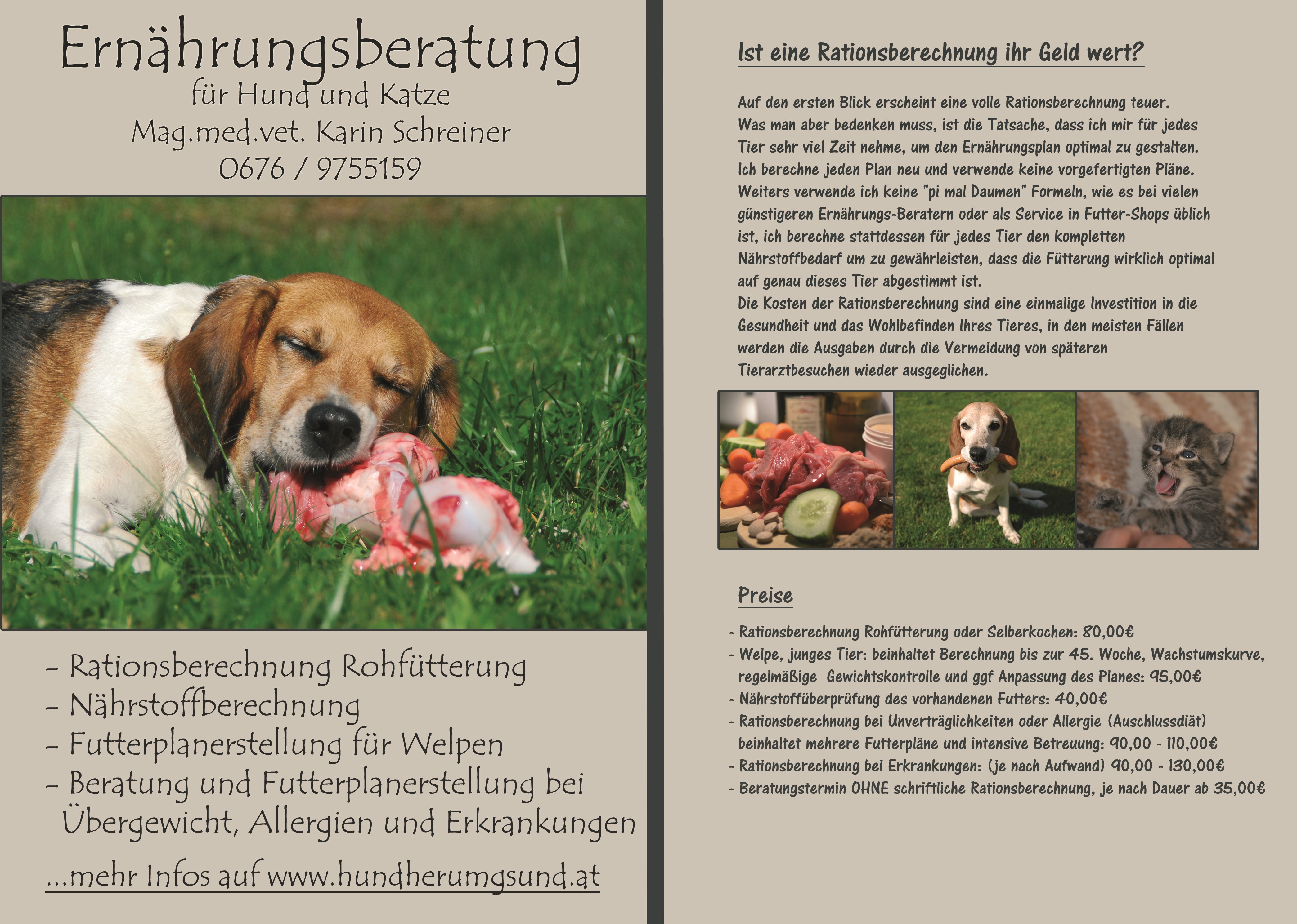 Kontaktdaten: Mag. Med. vet. Karin Schreiner, Ernährungsberatung für Hund und Katz, Mobil: 0676 9755 159